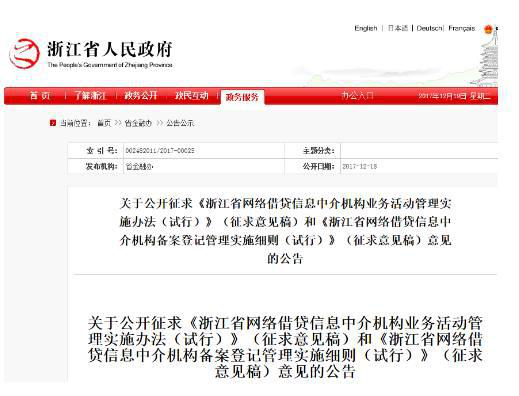 继广东、上海、北京之后,12月18日,浙江省人平易近当局反式发布了关于P2P存案登记细则收罗看法稿。通知布告全称:“关于公开收罗《浙江省收集假贷消息外介机构营业勾当办理实施法子(试行)》(收罗看法稿)和《浙江省收集假贷消息外介布局存案登记办理实施细则(试行)》(收罗看法稿)看法的通知布告”。