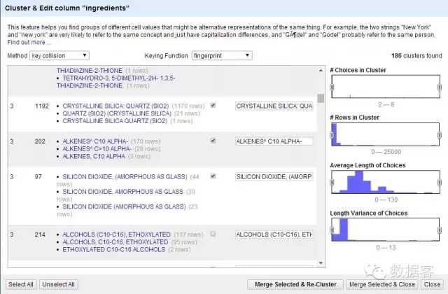 它是以前的GoogleRefine,OpenRefine是一款数据清理软件,能够对预备好的一切数据进行阐发。例如比来我清理了一个含无化学名称的数据库,而且各行无分歧的拼写、大小写、空格等,用计较机来处置很是坚苦,幸运的是, OpenRefine包含很多聚类算法,对那个问题能够快速处理。