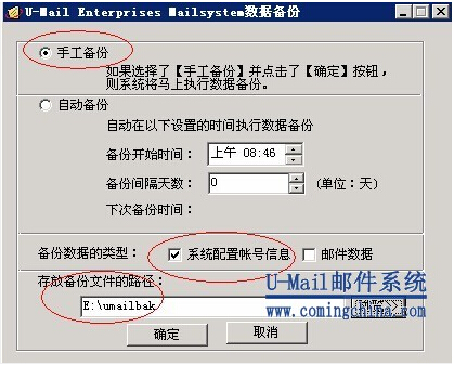 U-Mail邮件系统自带了备份功能,能够对“系统配放帐号消息”和邮件数据等手动或按时备份,对于办事器非常或办事器数据迁徙能够实现一键式恢复,很是便利,如下图: