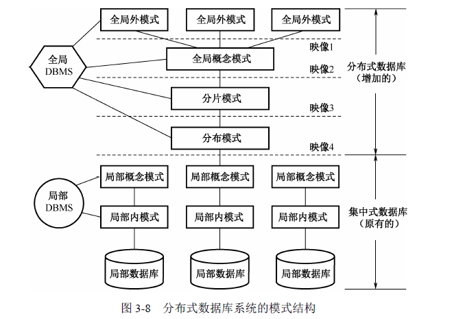 图 3-8 的模式布局从全体上能够分为两大部门:下半部门是集外式数据库的模式布局,代表了各局部场地上局部数据库系统的根基布局;上半部门是分布式数据库系统添加的模式级别。